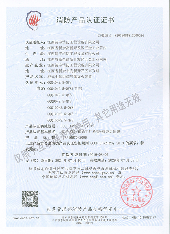 • 七氟丙烷滅火裝置認證證書